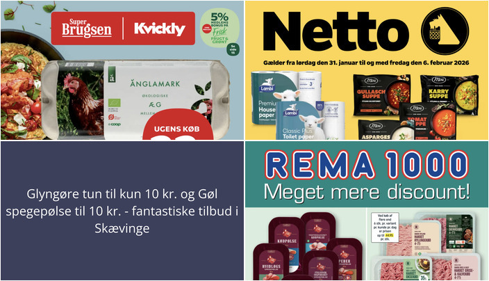 Vi har gennemgået denne uges tilbudsaviser for dagligvarebutikker i Skævinge og fundet nogle fremragende tilbud. Her er et udpluk af de bedste tilbud fra Netto, Rema 1000 og SuperBrugsen.